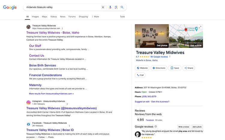 Here are the results we're getting for Treasure Valley Midwives in Boise, Idaho.